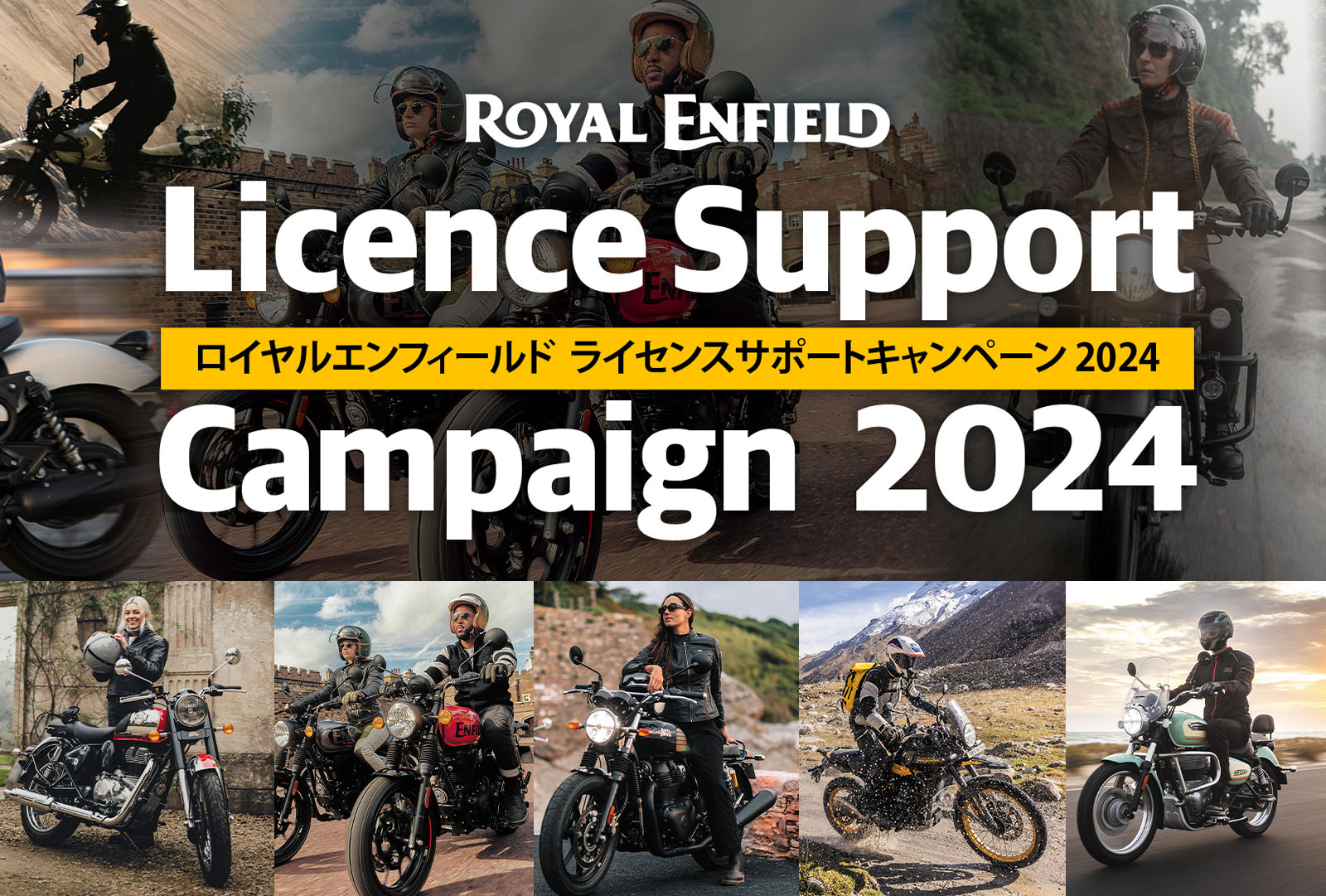 キャンペーン期間中に普通自動二輪免許(MT)、大型自動二輪免許(MT)を新規に取得し、対象モデルの新車をロイヤルエンフィールド正規販売店で購入したお客様に、免許取得費用の一部として普通自動二輪免許の場合 33,000円(税込)、大型二輪免許の場合 55,000円をサポートいたします。